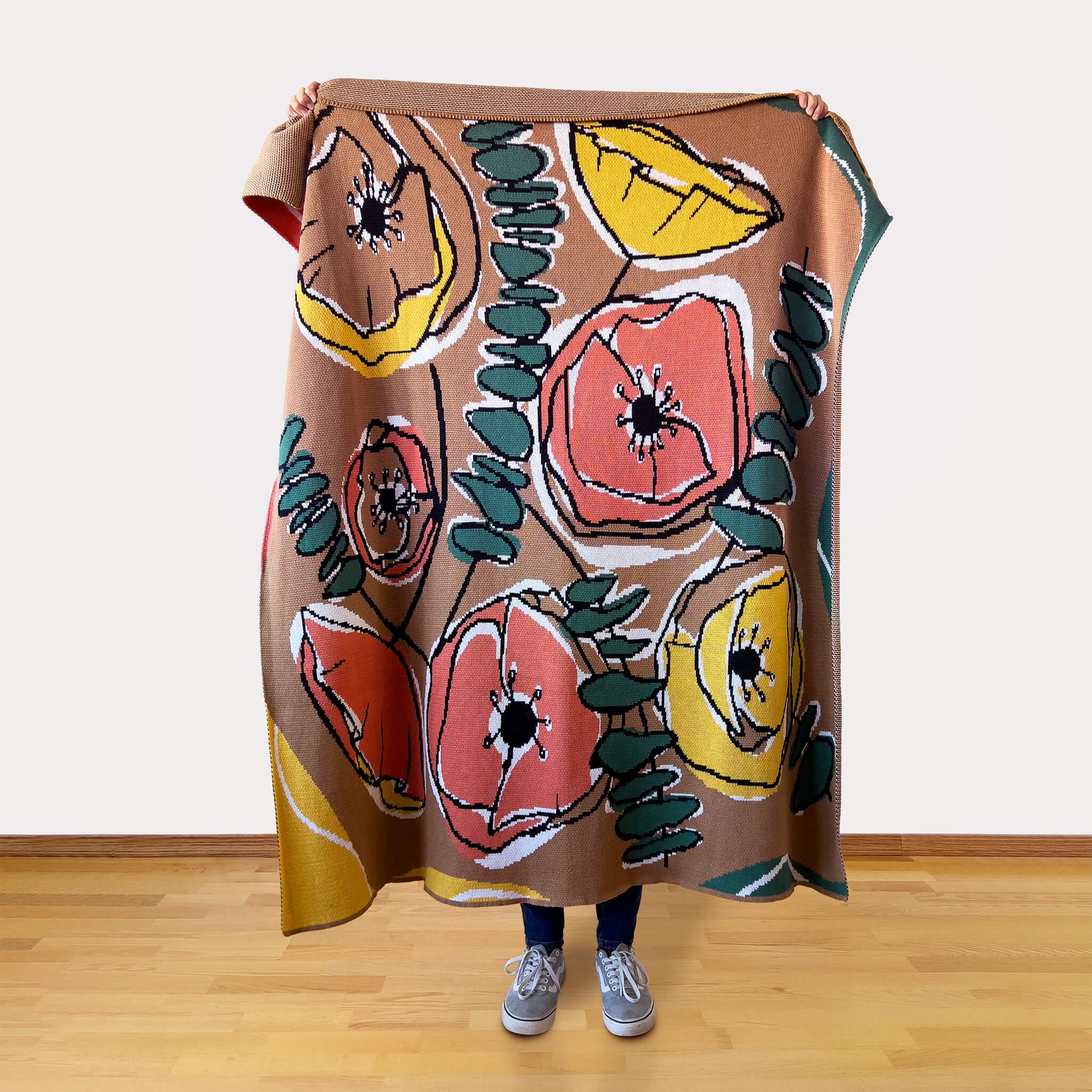 At Tuxberry & Whit, we believe functional textiles should work as both art statements and bold design accents. This retro poppy throw combines loose botanical illustration with distinctive color choices and printmaking-inspired technique—creating something that transforms your space whether you need a pop of color or an artistic focal point.